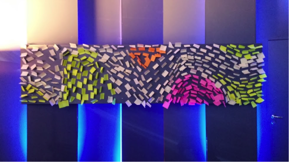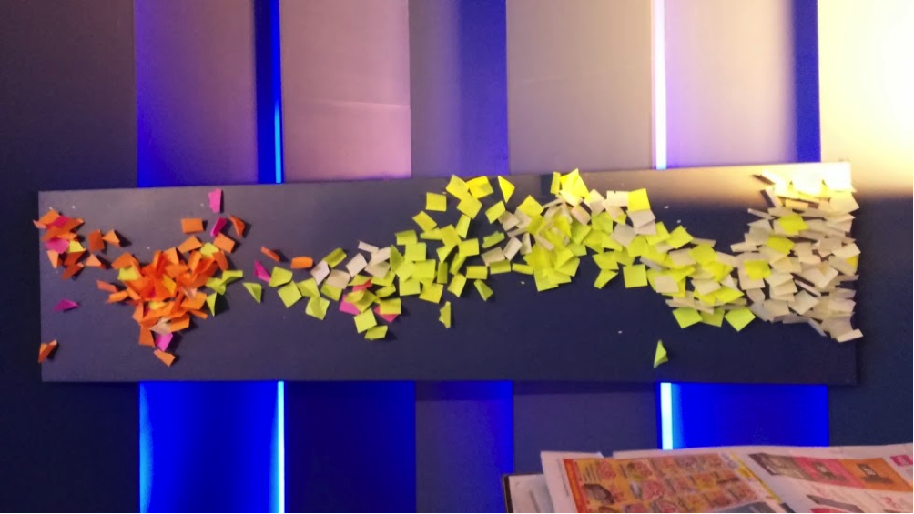 Työtehtävissäni pääsin toteuttamaan myös kaikenlaista, esimerkiksi maalasin, tein kattauksia, paketoin lahjapaketteja ym. Sain myös todella mielenkiintoisen ja haastavan tehtävän, sillä sain tehdä ”post it” lapuilla kaksi seinäkollaasia ja sain toteuttaa ne haluamallani tavalla. Olin todella otettu siitä, että lavastaja luotti kykyihini niin paljon.